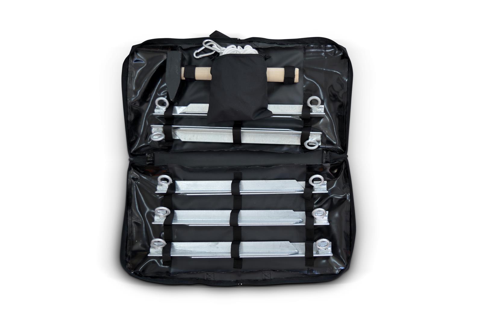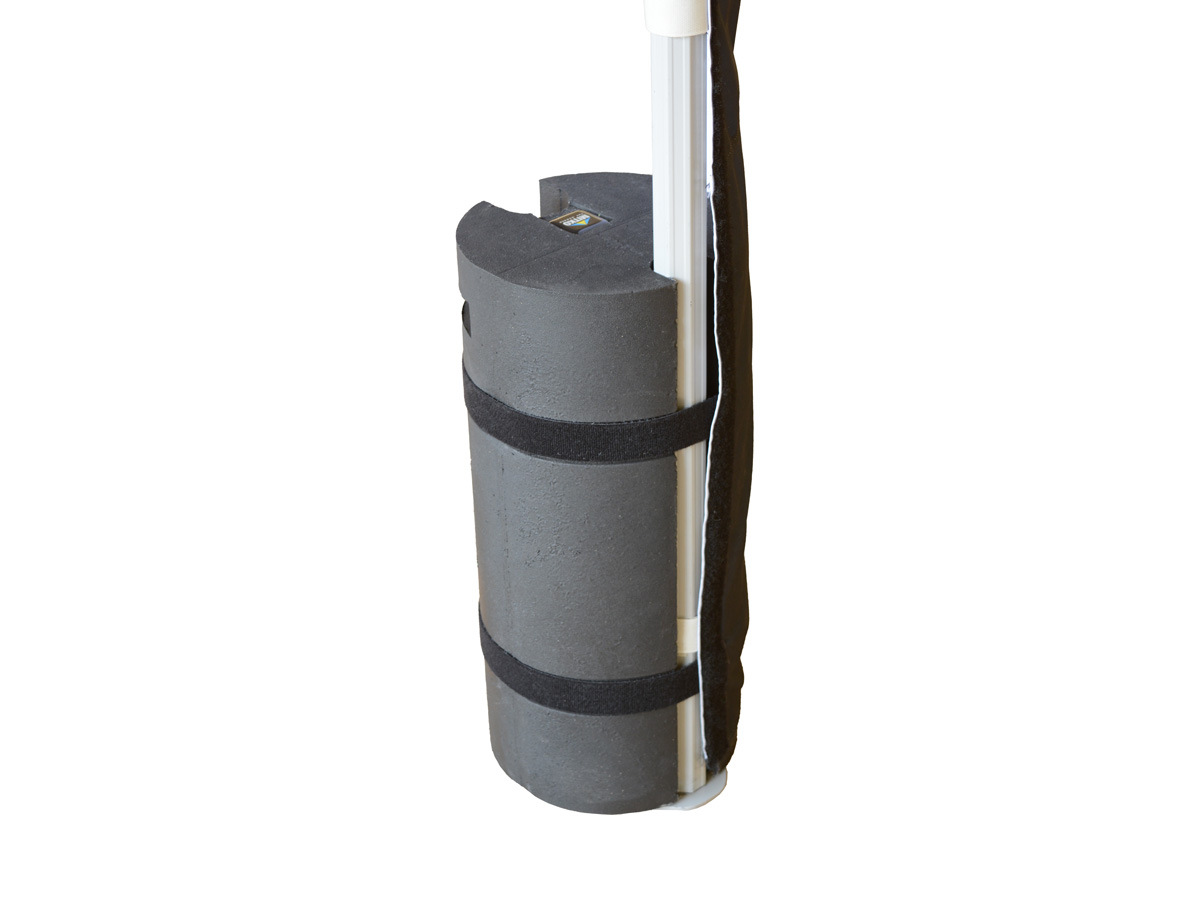 Alle Gewichte werden am Fuß des Zeltes angebracht. Die Sandgewichte und die Gummigewichte haben zusätzlich noch Klettbänder zur Befestigung.