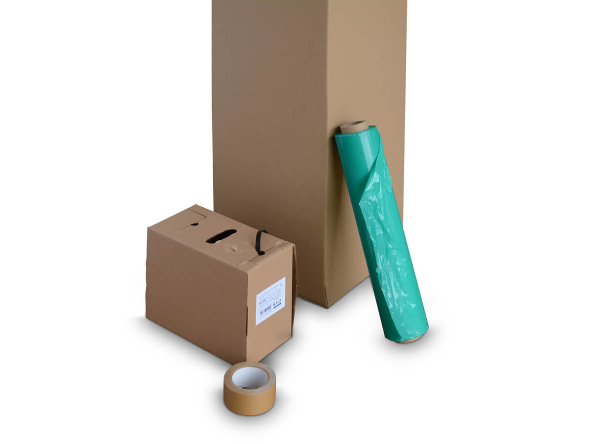 Kartonagen für den Transport bestehen aus recyceltem Papier, von nicht verkauften Zeitungen. Folien und Bänder sind ökozertifiziert.