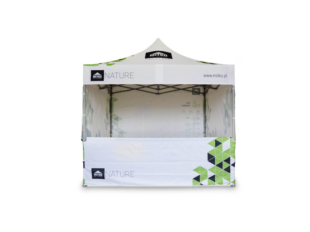 Fragen der Nachhaltigkeit und damit die Einsparung von Ressourcen sind brennende Themen in unserer Gesellschaft. Mit der Einführung des Zeltsystem NATURE werden Polyesterstoffe aus recycelten PET-Flaschen verarbeitet. Dächer und Seitenwände können aus diesem besonderen Polyesterstoff hergestellt werden. Für ein Dach in der Größe 3x3m wurden ca. 277 PET-Flaschen recycelt.